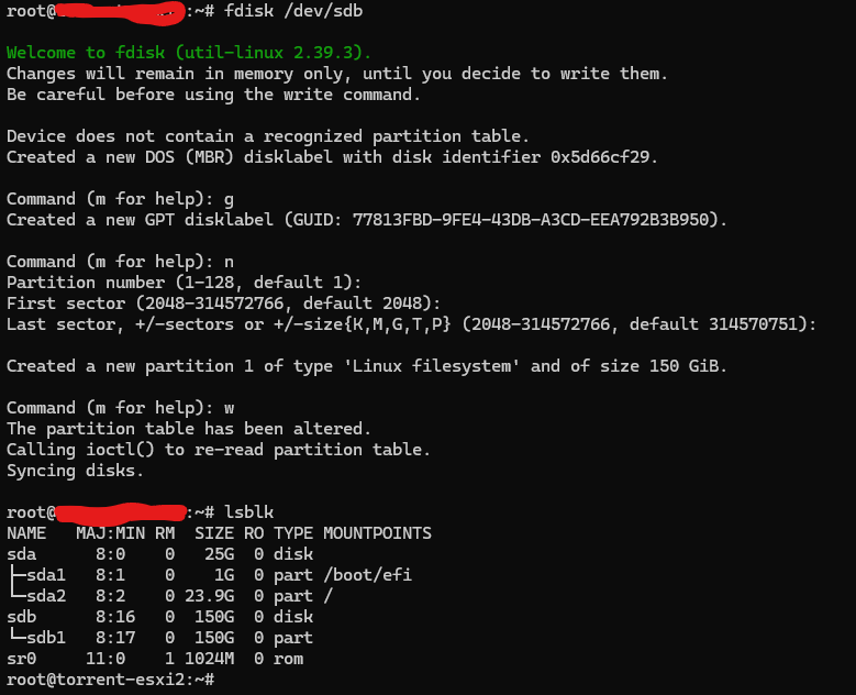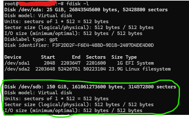 root@hostname:~# fdisk -l Disk /dev/sda: 25 GiB, 26843545600 bytes, 52428800 sectors Disk model: Virtual disk Units: sectors of 1 * 512 = 512 bytes Sector size (logical/physical): 512 bytes / 512 bytes I/O size (minimum/optimal): 512 bytes / 512 bytes Disklabel type: gpt Disk identifier: F3F2DD2F-F6E4-48BD-9D1B-2407D4DE4D0D Device Start End Sectors Size Type /dev/sda1 2048 2203647 2201600 1G EFI System /dev/sda2 2203648 52426751 50223104 23.9G Linux filesystem Disk /dev/sdb: 150 GiB, 161061273600 bytes, 314572800 sectors Disk model: Virtual disk Units: sectors of 1 * 512 = 512 bytes Sector size (logical/physical): 512 bytes / 512 bytes I/O size (minimum/optimal): 512 bytes / 512 byte
